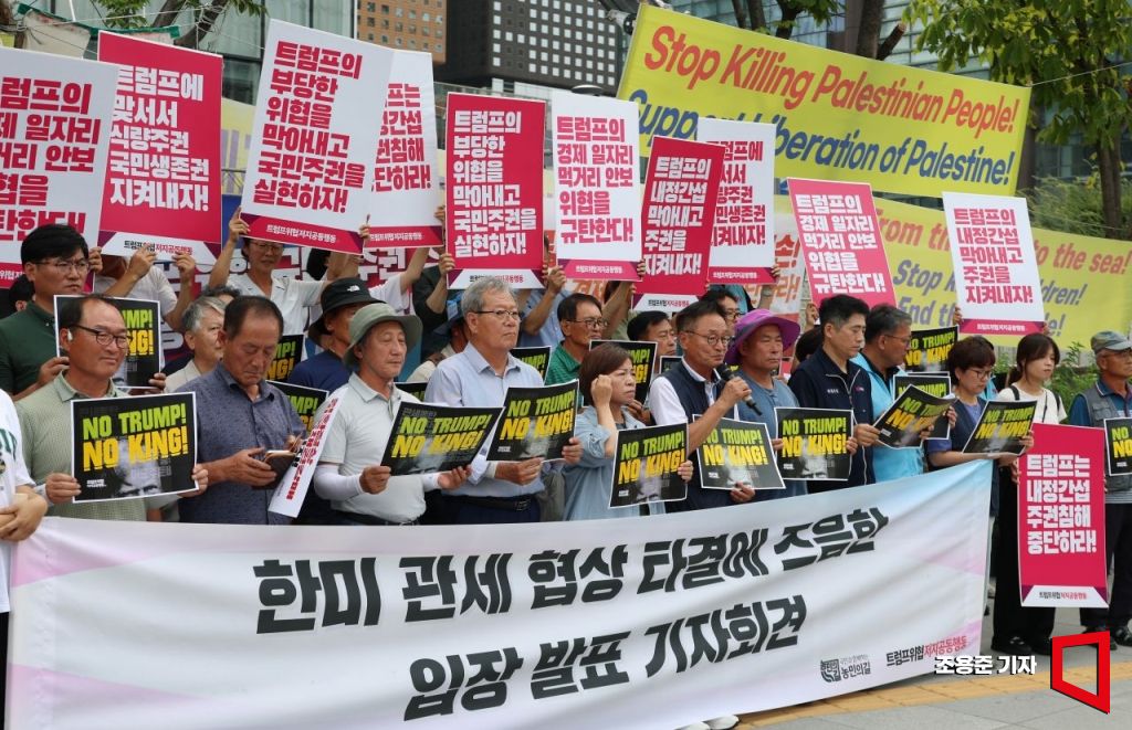 트럼프위협저지공동행동 및 시민단체들이 31일 서울 종로구 미대사관 인근에서 한미관세 협상 타결 관련 기자회견을 갖고 입장발표를 하고 있다.