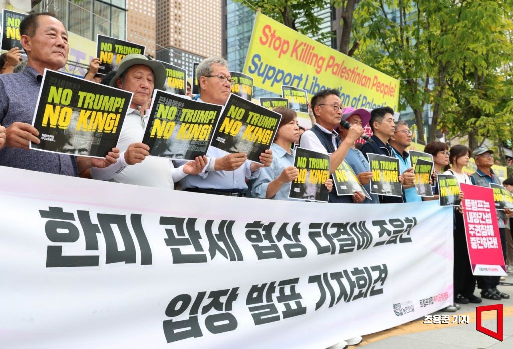 트럼프위협저지공동행동 및 시민단체들이 31일 서울 종로구 미대사관 인근에서 한미관세 협상 타결 관련 기자회견을 갖고 입장발표를 하고 있다.