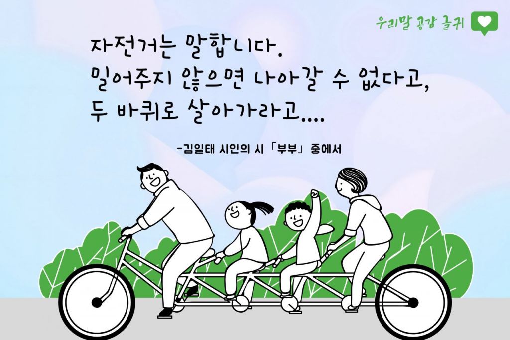 경남 창원특례시는 8월의 '우리말 공감 글귀'로 김일태 시인의 시 '부부'의 한 구절인 "자전거는 말합니다. 밀어주지 않으면 나아갈 수 없다고, 두 바퀴로 살아가라고…"를 선정했다고 31일 밝혔다.