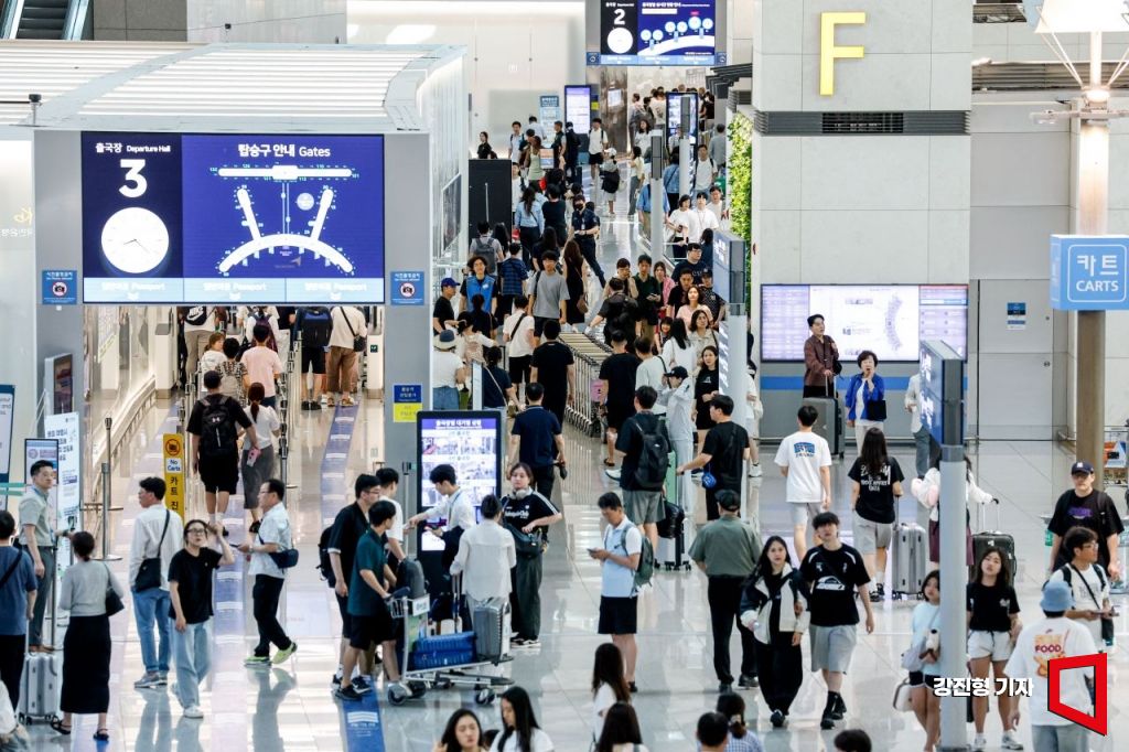 본격적인 여름 휴가철을 앞둔 25일 인천국제공항 제1여객터미널 면세구역을 찾은 여행객들로 붐비고 있다. 인천공항공사는 여름철 성수기인 7월말부터 8월초까지 3주간 약 391만명이 인천공항을 이용할 것으로 내다봤다. 2025.7.25. 강진형 기자
