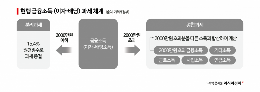 기획재정부는 31일 발표한 2025년 세제개편안을 통해 고배당기업으로부터 받은 배당소득에 대해 종합소득세에서 분리과세하는 세제 특례를 2026년부터 도입한다고 밝혔다. 현행 배당소득 과세 체계에서는 이자소득과 배당소득을 합산한 금융소득이 연간 2000만원 이하일 경우 15.4%(소득세 14% + 지방소득세 1.4%) 세율로 원천징수해 분리과세한다. 하지만 이 기준을 초과하면 초과분은 근로·사업소득 등과 합산돼 소득구간별로 종합소득세율(6.6~49.5%)이 적용된다.
