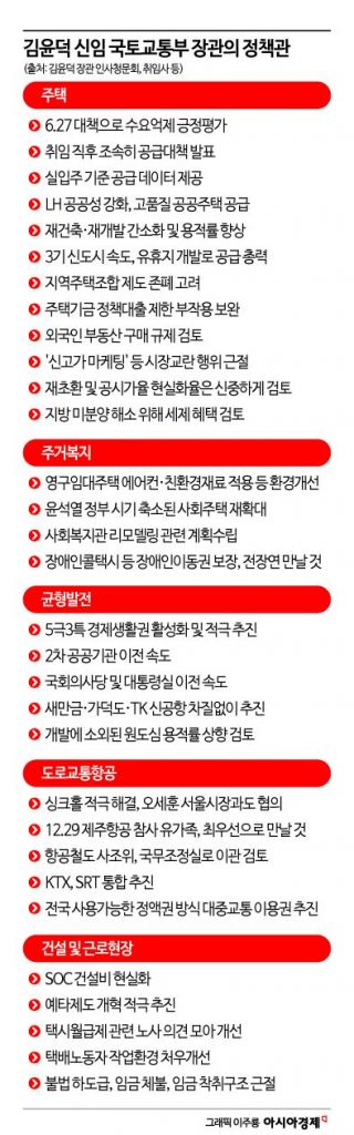 민간 부문 활성화를 위해 재개발·재건축의 절차를 간소화하고 용적률 조정을 검토하되, 민간과 공공의 이익을 균형 있게 추구하겠다는 것이 김 장관의 입장이다. 다만 재건축초과이익환수제(재초환)와 공시가율 현실화에 대해서는 명확한 방향을 제시하지 않았으며 신중하게 검토할 것으로 보인다. 지방 미분양 문제의 경우 정부의 '컨트롤 타워 역할'을 강화하고 재정 투입, 세제 혜택, 총부채원리금상환비율(DSR) 규제 완화 등 '특단의 조치'에 나설 것으로 예상된다.