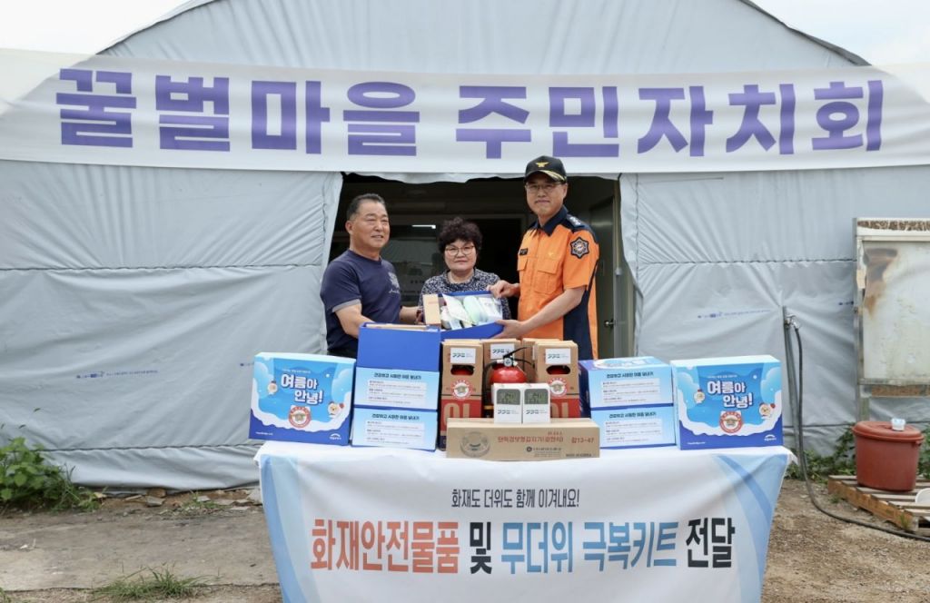 김재병 경기도소방재난본부장이 31일 과천 꿀벌마을을 찾아 주민들에게 화재 안전물품과 무더위 극복키트를 전달하고 있다. 경기도소방재난본부 제공