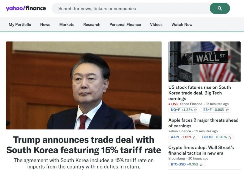 미국 경제 포털사이트 야후 파이낸스가 도널드 트럼프 미국 대통령이 한국과 무역 협상을 타결했다는 기사를 보도하면서, 윤석열 전 대통령의 사진을 메인 첫 화면에 게재하는 실수를 저질렀다. 한국 시각으로 오전 7시 38분 작성된 이 기사의 사진은 오후 5시에도 교체되지 않고 메인 첫 화면에 유지됐다.