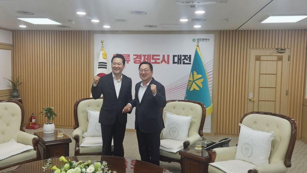 국민의힘 8·22 전당대회에서 당 대표 선거에 나선 장동혁 의원(왼쪽)이 31일 오후 대전시청에서 이장우 대전시장을 만나 당과 충청지역 발전에 대한 의견을 나눴다.