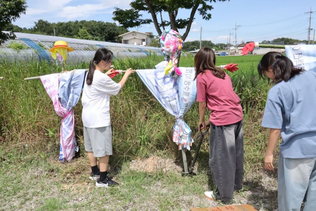 담양군 청소년들이 폐현수막을 재활용한 허수아비를 제작해 들녘에 설치하고 있다. 담양군 제공