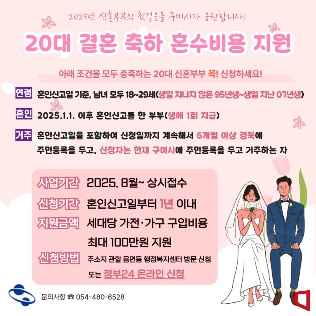 이번 사업은 결혼과 함께 구미시에 정착한 20대 청년 신혼부부의 초기 경제 부담을 덜어주기 위한 실질적인 지원책으로 ▲혼인신고일 기준 부부 모두 (1995년생 2007년생) ▲2025년 1월 1일 이후 혼인신고를 완료한 부부 ▲혼인신고일부터 신청일까지 6개월 이상 경북에 주민등록을 두고 현재 구미시에 거주하는 경우 등 세 가지 요건을 모두 충족해야 신청할 수 있다.