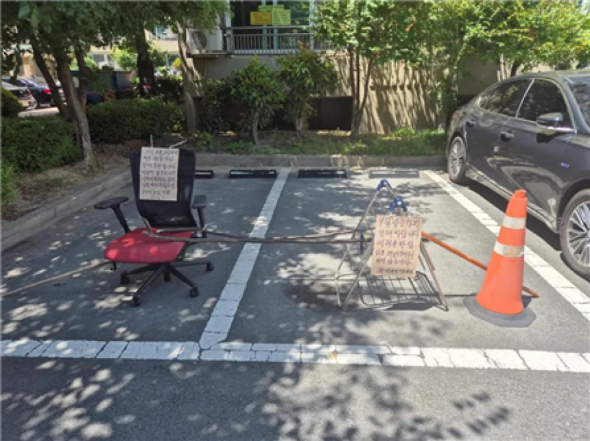 누리꾼이 공개한 주차장 점거 모습. 의자와 건조대 등으로 차량 진입을 막은 모습이다. 온라인 커뮤니티