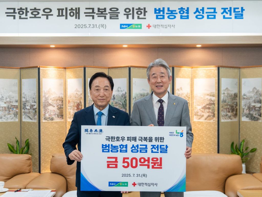 대한적십자사(회장 김철수)는 31일 농협(회장 강호동)이 호우로 극심한 피해를 입은 이재민을 지원하고 지역사회의 재난복원력 강화를 위해 대한적십자사에 50억 원을 기탁했다고 밝혔다.