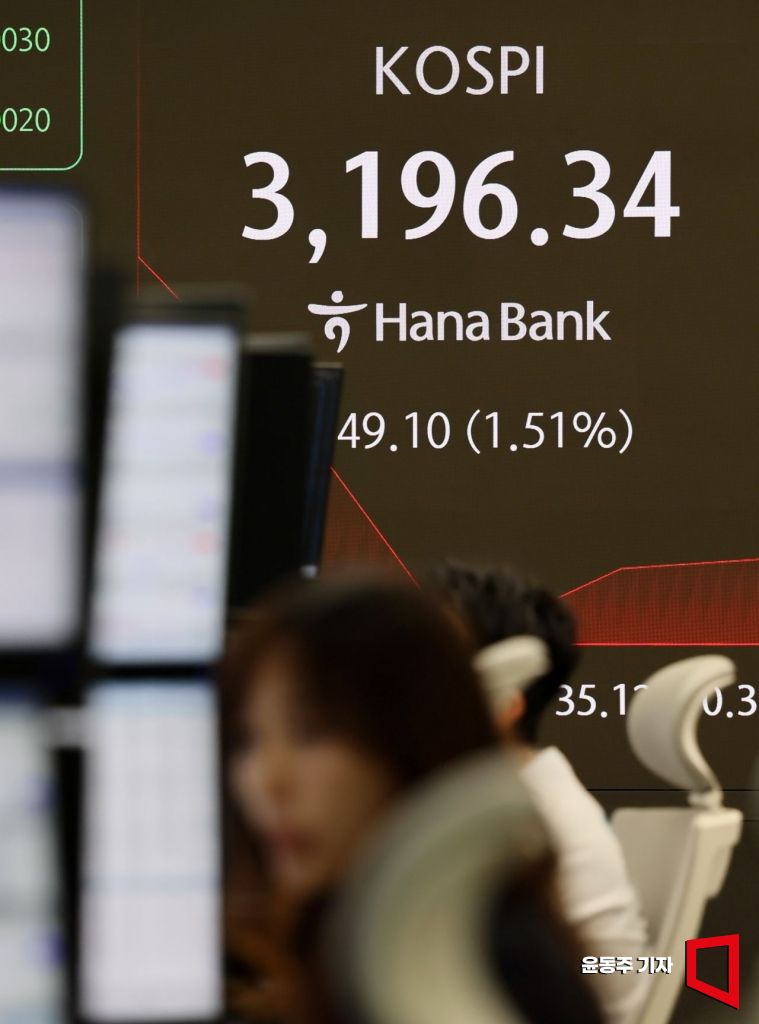 코스피 지수가 전 3,200선을 내주며 하락으로 장을 시작한 1일 서울 중구 하나은행 딜링룸 현황판에 지수가 표기 되고 있다.