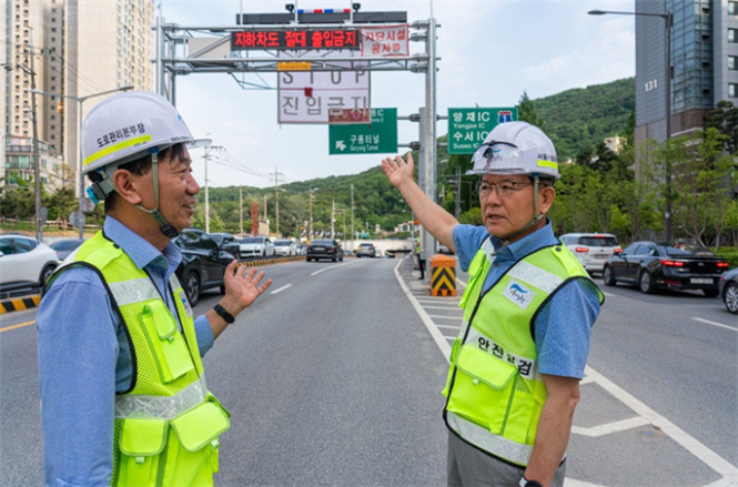 한국영 서울시설공단 이사장(사진 오른쪽)이 서울 강남구 개포 지하차도에서 재난 상황 발생시 차량 진입을 막는 지하차도 진입차단시설을 점검하고 있다. 서울시설공단 제공.