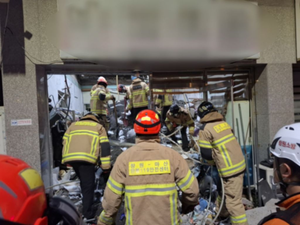 소방대원들이 무너진 잔해 사이를 헤치며 구조작업을 하고 있다. 창원소방본부 제공