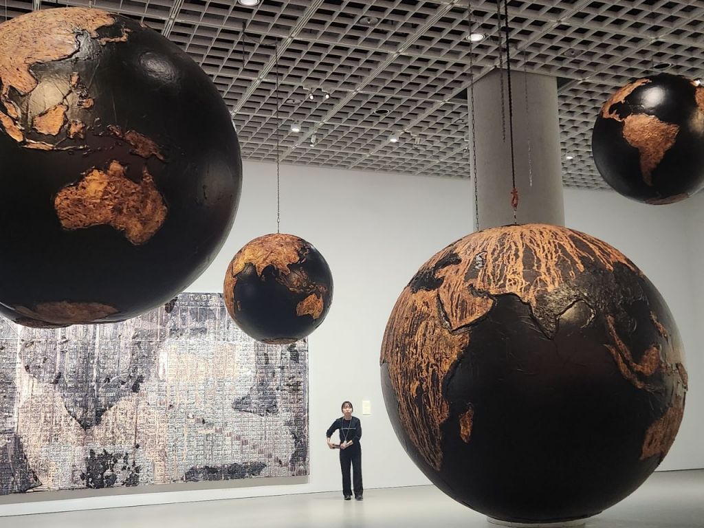 '그는 잿더미의 왕이 되기 위해서라도 나라가 타오르는 것을 볼 것이다'(2019) 작품은 범세계적 불평등을 꼬집는다. 여러 개의 구체로 형성된 작품은 종이로 만든 불탄 대륙과 바다를 통해 파편화된 세계의 모습을 시각화한다. 각기 다른 질감과 크기는 뷸균형과 고립, 생태 위기가 심화하는 지구의 현실을 날카롭게 파헤친다. 드라마 '왕좌의 게임' 대사를 인용한 제목은 파괴적 권력 욕망이 초래하는 사회적 붕괴와 정치적 몰락에 대한 비판적 함의를 담고 있다. "이 작품은 불평등에 관한 이야기다. 사람들은 같은 지구에 살지만, 전혀 다른 조건 속에서 살아간다."