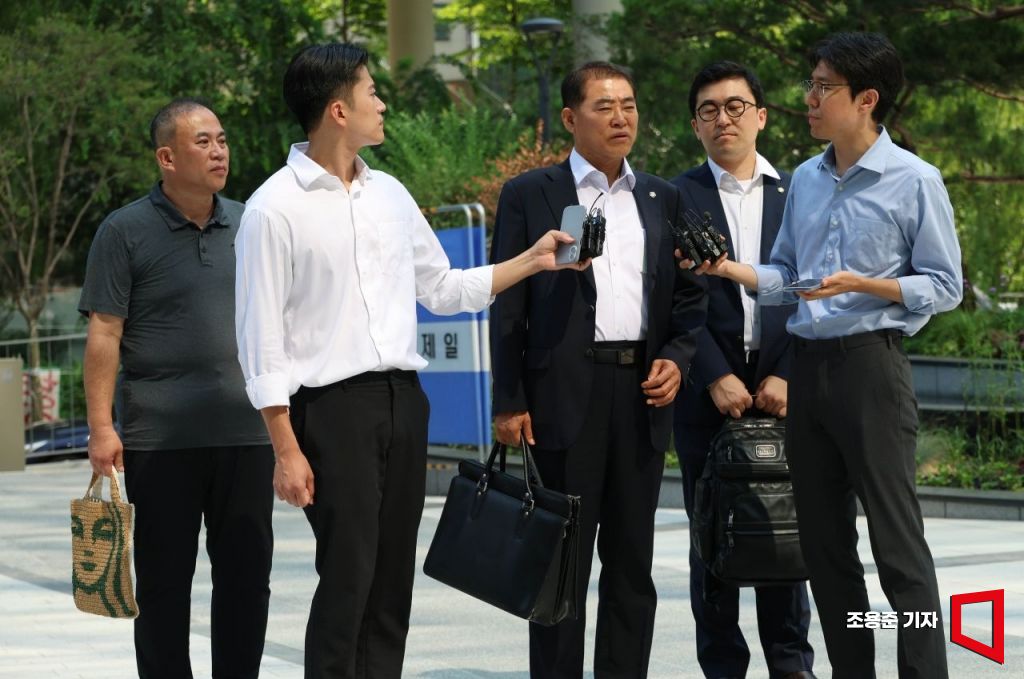 공천개입 의혹을 받는 정치 브로커 명태균씨가 1일 뇌물공여 혐의 피의자 신분으로 조사를 받기 위해 서울 종로 KT광화문 빌딩에 마련된 김건희 특검 사무실로 이틀째 출석하며 변호인의 답변을 듣고 있다.