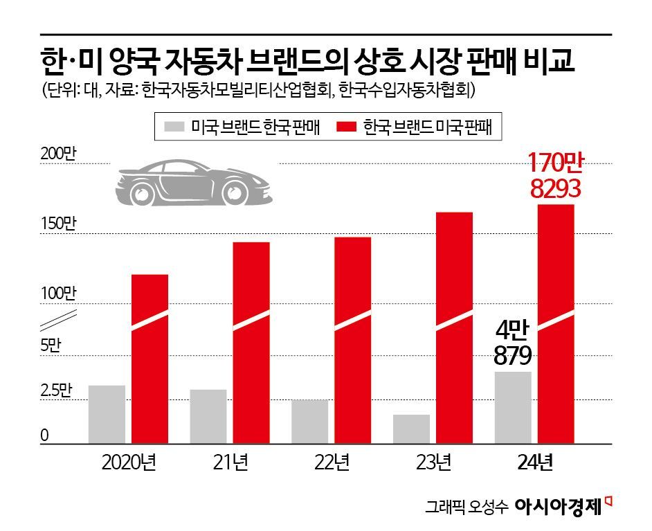 1일 업계에 따르면 지난해 한국 시장에서 미국차의 점유율은 2.5%로 4만대가량 판매됐다. 국내 진출한 미국차는 테슬라, 포드, 지프, 링컨, 캐딜락, 쉐보레, GMC 등 7개 브랜드다. 반면 미국 시장에서 현대차·기아 점유율은 10.7%로 연간 170만대 이상 팔렸다.