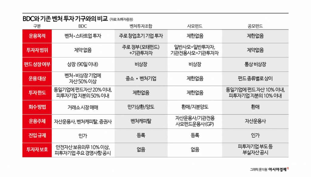 BDC는 기업공개(IPO)로 투자자 자금을 모집해 주식시장에 상장하는 집합투자기구(펀드)다. 자산 가운데 50% 이상을 벤처와 비상장기업에 투자해야 하고, 최소 존속기간 5년 이상을 유지해야 한다. BDC를 취급하는 곳은 일정 규모 이상의 자기자본과 운용 인력을 보유하고, 이해상충 방지 체계를 갖춘 자산운용사, 증권사, 벤처캐피털(VC) 등이다. 비상장기업 유상증자를 통한 신주 매매, 기존 주식(구주)의 블록딜 매매, 전환사채(CB)·신주인수권부사채(BW) 등 메자닌 채권 인수 등 다양한 방식으로 투자할 수 있다.