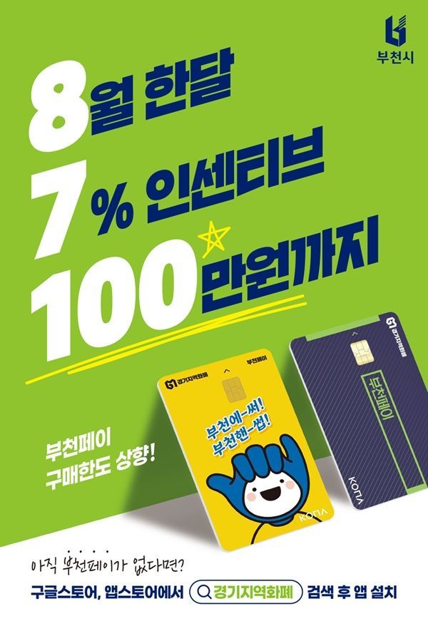 1일 시에 따르면 7월은 인센티브를 받을 수 있는 월 구매 한도가 70만원이었으나, 8월 한 달간은 100만원으로 확대된다. 이에 따라 이달 부천페이를 충전하는 시민은 7% 인센티브를 적용받아 최대 7만원의 혜택을 받을 수 있다.