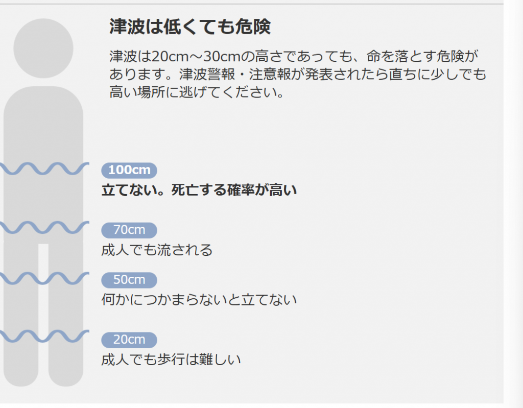 쓰나미가 높이 20~30cm만 되어도 위협적이라는 것을 경고하는 야후 재팬의 그래픽. 20cm만 되어도 성인이 걷기 힘든 정도라고 설명하고 있다. 야후재팬.