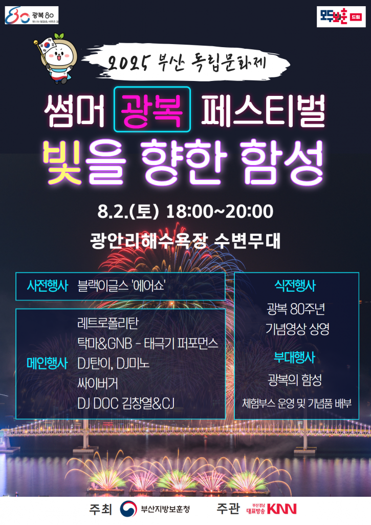국가보훈부 부산지방보훈청(청장 이남일)은 광복 80주년을 기념해 2일 오후 6시 광안리 해수욕장에서 독립문화제 '썸머 광복 페스티벌, 빛을 향한 함성'을 개최한다.
