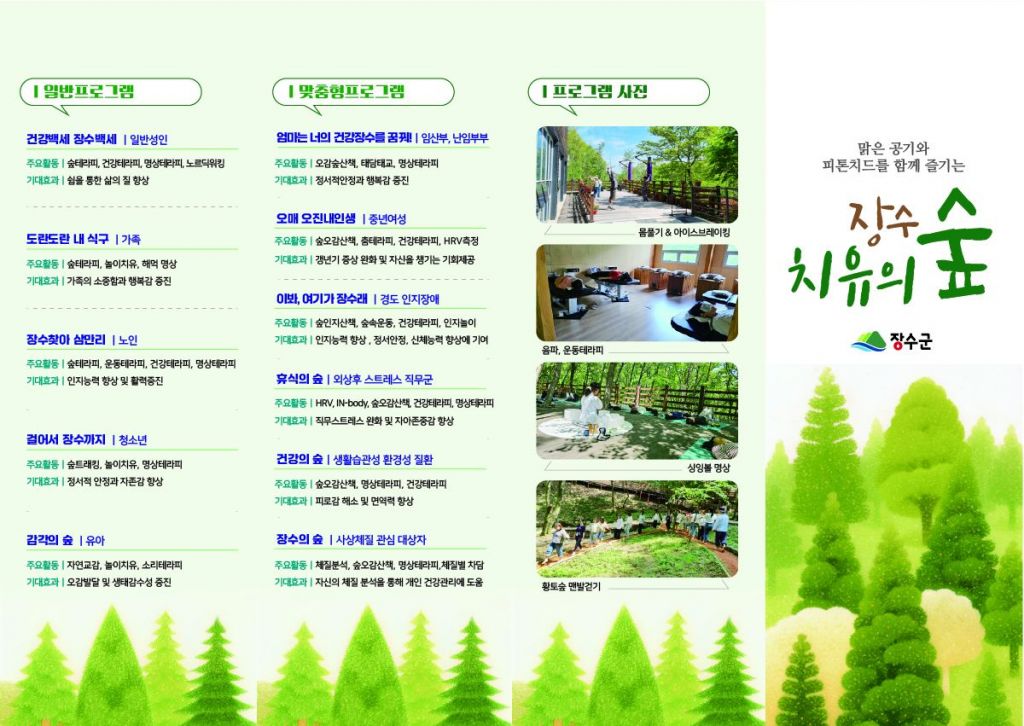 현재 도에서 운영 중인 공립 치유의 숲은 장수군의 그린장수 치유의 숲과 부안군의 위도 치유의 숲이 대표적이다. 이들 시설에서는 전문 치유지도사가 상주해 숲길 걷기, 싱잉볼 명상, 이완호흡 등 다양한 맞춤형 산림치유 프로그램을 제공하고 있다.