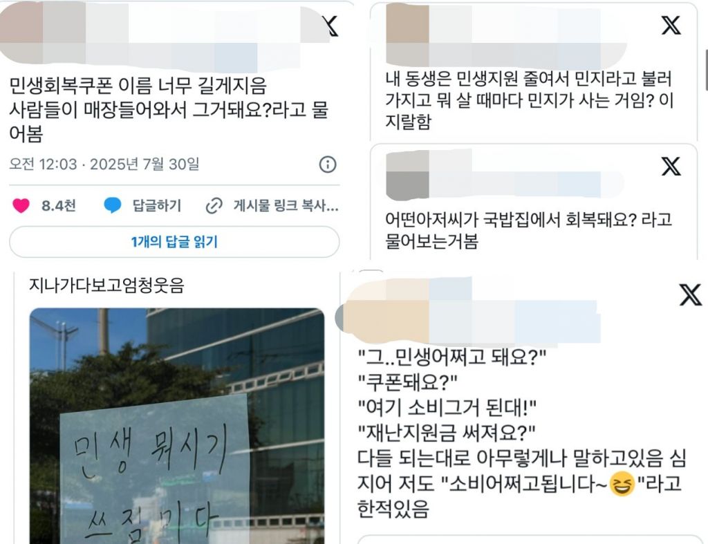 한 누리꾼은 SNS에 "민생회복쿠폰 이름 너무 길게 지었다. 사람들이 매장 들어와서 '그거 돼요?'라고 물어본다"고 적었다. 이 글에는 "민생 어쩌고 돼요? 쿠폰 돼요? 소비 그거 돼요? 재난지원금 써져요?"처럼 생각나는 대로 부른다는 글들이 이어졌다. 또 다 누리꾼은 "내 동생은 민생지원을 줄여서 '민지'라고 부른다. 뭐 살 때마다 '민지가 사는 거?'라고 묻는다"고 전했다. 한 국밥집에서는 "회복돼요?", "민심 회복돼요?"라고 묻는 손님도 있었다는 후기도 올라왔다. 상가 주인들은 "민생 뭐시기 쓰짐미다"라고 써 붙이거나 "민생 회복 쿠폰 가능, 민생 뭐시기 가능, 민생 가능, 회복 가능, 이재명 카드 가능, 나랏돈 가능, 민회쿠 가능, 그거 가능, 인생 역전 불가능"이라는 안내문을 붙인 곳도 있었다.