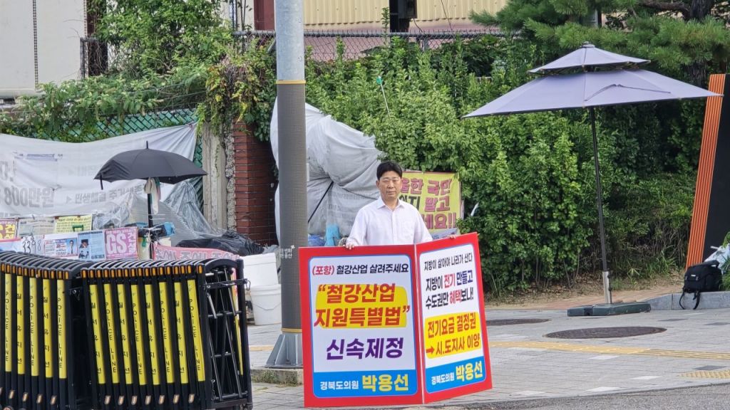 박용선 경북도의원(국민의힘·포항)은 1일 오전, 서울 용산 대통령실 앞에서 산업용 전기요금 반값 인하를 강력히 촉구하는 1인 시위에 나섰다. 박용선 도의원은 이날 시위를 통해 현재 국내 철강산업은 물론 지방 제조업 전반이 처한 산업용 전기료에 대한 국가 정책의 근본적인 전환을 요구했다.