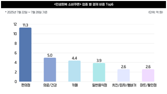 지난달 7월22일부터 28일까지의 1차 결제 데이터를 분석한 결과 소비쿠폰이 가장 많이 쓰인 업종은 편의점(11.3%)이었으며 이어 의료/건강(5.0%), 카페(4.4%), 일반음식점(3.9%) 순으로 나타났다. 이는 소비자들이 가장 일상적인 생활 공간에서 실질적인 지출을 한 것으로 정책의 실효성을 보여주는 결과로 해석된다.
