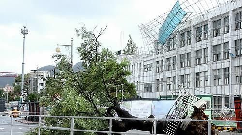 광주 동구 옛 전남도청 앞 회화나무가 태풍 피해를 입고 쓰러져 있다. 연합뉴스