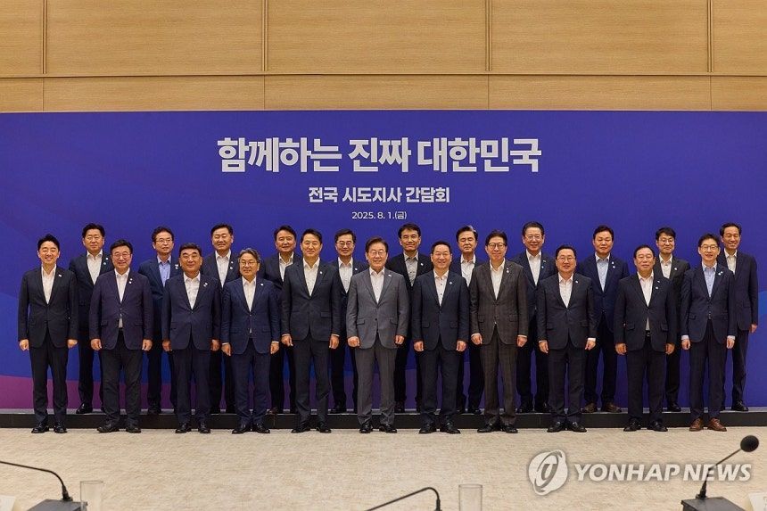 이재명 대통령과 전국 17개 광역자치단체장들이 1일 간담회를 마치고 기념 촬영을 하고 있다. /사진= 연합뉴스