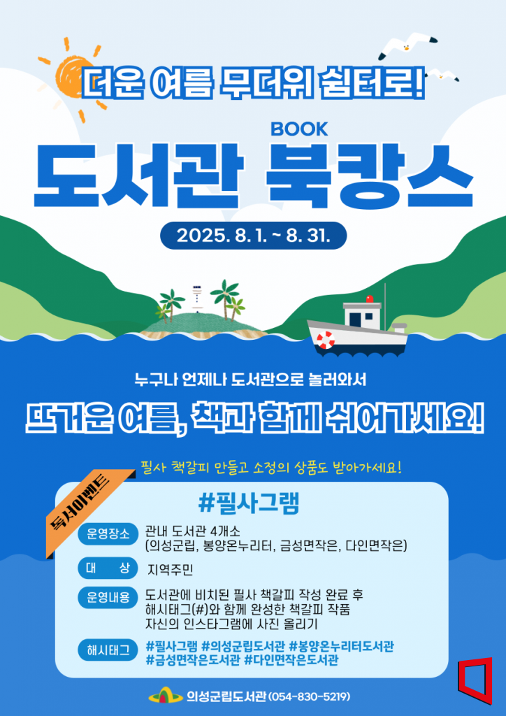 경북 의성군이 8월 한 달간 관내 도서관을 무더위쉼터로 개방하고, 책과 문화 체험을 결합한 「도서관 북캉스(book+vacance)」 프로그램을 운영한다.