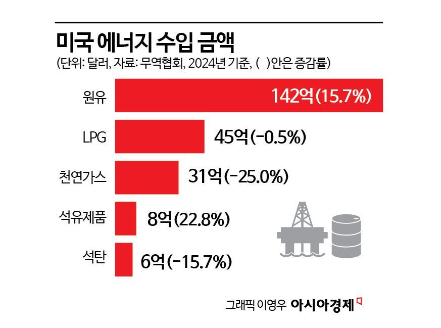 1일 산업통상자원부 및 무역협회에 따르면 지난해 우리나라는 미국으로부터 원유 142억 달러, 액화석유가스(LPG) 45억 달러, 천연가스 31억 달러, 석유 제품 8억 달러, 석탄 6억 달러 등 232억달러 규모의 에너지를 수입했다.