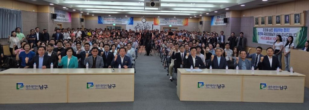 이날 오후 광주 남구청 8층 대회의실에서 열린 정 의원 의정활동 '1년 성과 시민보고대회'에는 정 의원과 주월동지역주택조합원, 남구민 등 500여명이 참석했다.