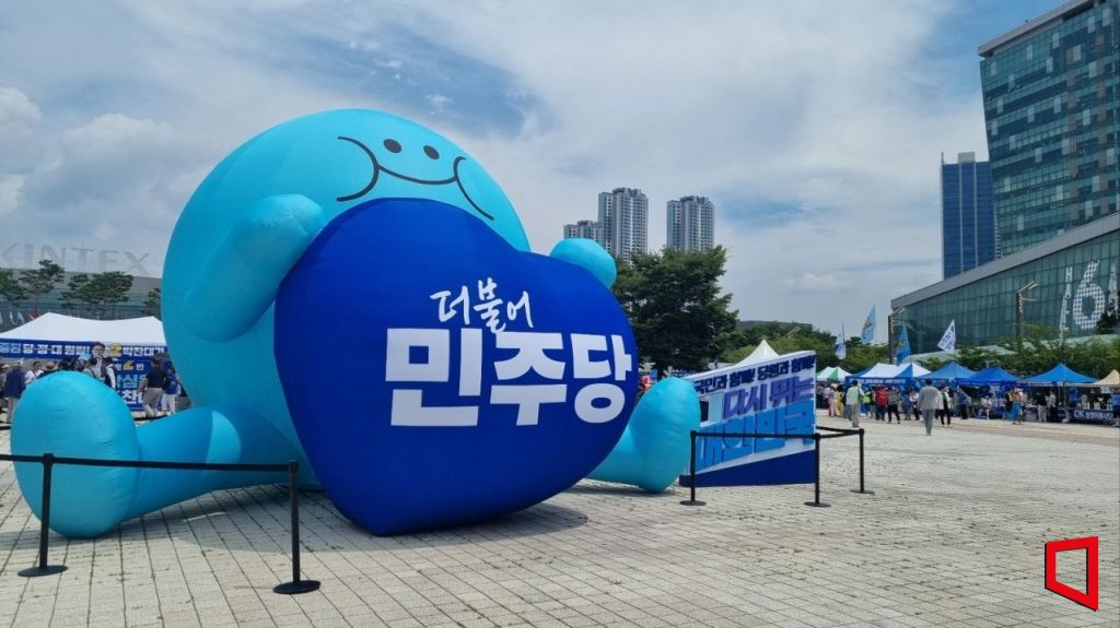 8.2 더불어민주당 전당대회가 열린 2일 서울 고양 일산 킨텍스 행사장 앞에 민주당 마스코트 조형물이 설치돼있다. 문혜원 기자