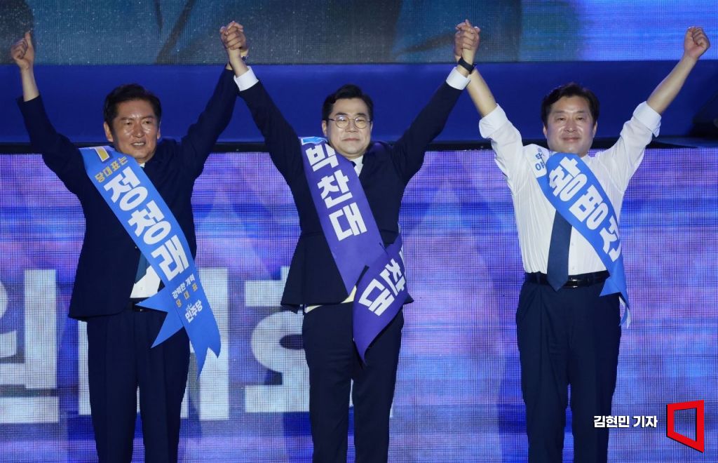 더불어민주당 정청래(왼쪽부터)·박찬대 당대표 후보, 황명선 최고위원 후보가 2일 경기 고양시 킨텍스에서 열린 전국당원대회에서 손을 잡고 인사하고 있다.