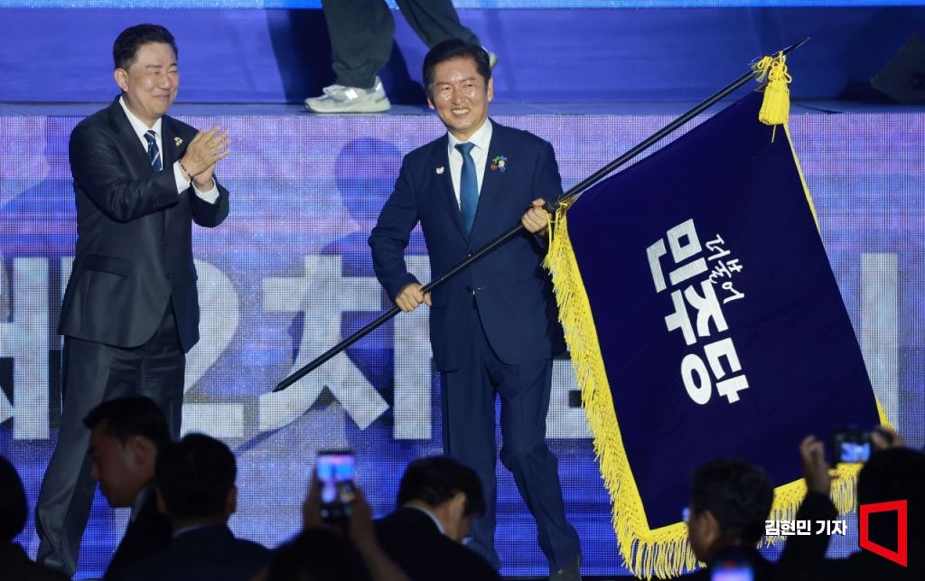 정청래 더불어민주당 신임 당대표가 2일 경기 고양시 킨텍스에서 열린 전국당원대회에서 김병기 당대표 직무대행 겸 원내대표로부터 받은 당기를 흔들고 있다. 김현민 기자