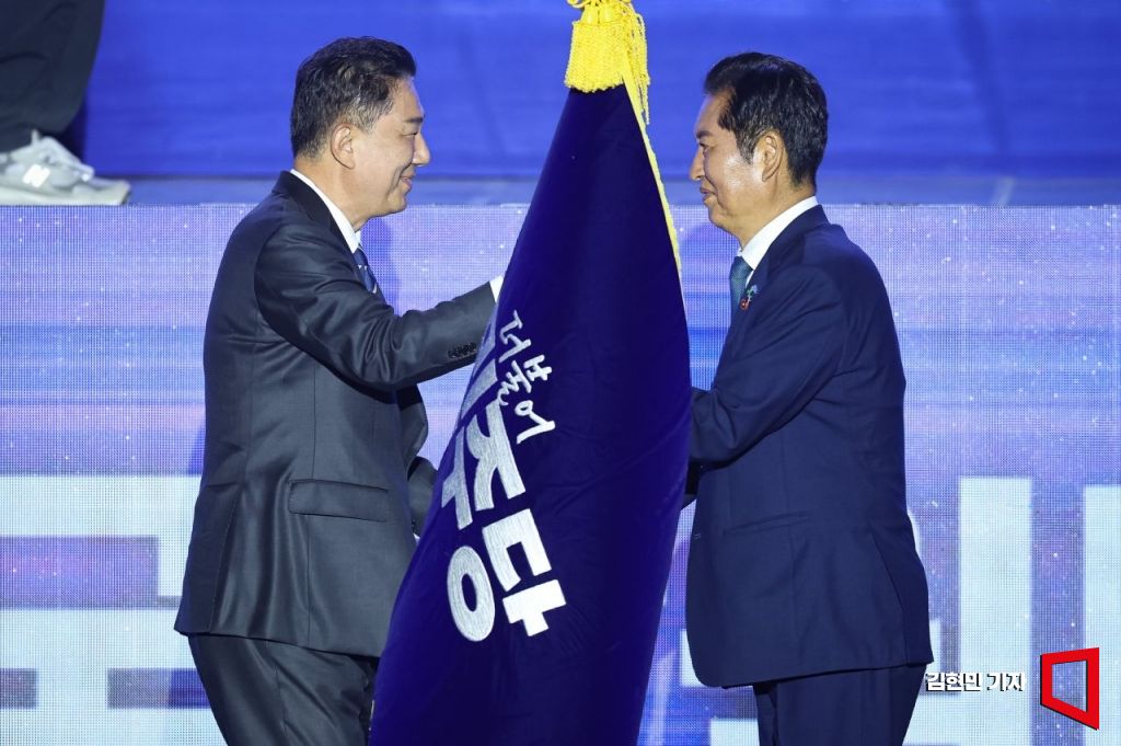 정청래 더불어민주당 신임 당대표가 2일 경기 고양시 킨텍스에서 열린 제2차 임시전국당원대회에서 김병기 원내대표로 부터 당기를 이양받고 있다. 2025.8.2 김현민 기자