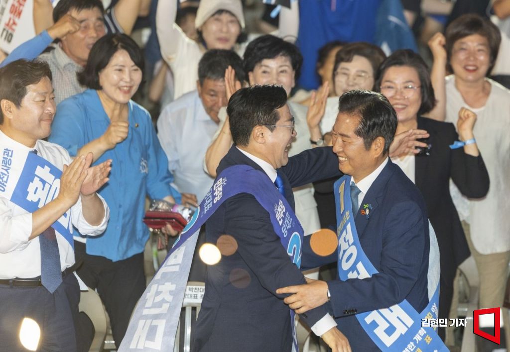 정청래 더불어민주당 신임 당대표와 박찬대 후보가 2일 경기 고양시 킨텍스에서 열린 제2차 임시전국당원대회에서 당선 발표 후 포옹하고 있다.