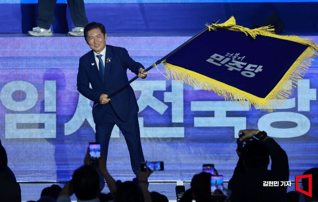 정청래 더불어민주당 신임 당대표가 2일 경기 고양시 킨텍스에서 열린 전국당원대회에서 김병기 당대표 직무대행 겸 원내대표로부터 받은 당기를 흔들고 있다. 2025.8.2 김현민 기자