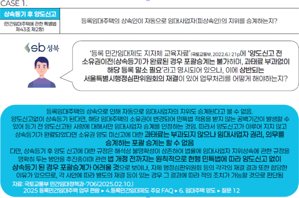 대표적인 행정민원사례로 '임대사업자가 사망한 경우 상속자가 상속등기 후 양도신고를 하면, 등록 말소 대상이 되는가'에 대해 민간임대법에서는 명시 규정이 없다. 시는 국토부 관원질의, 법제처 법령해석을 통해 하나로 통일된 지침을 본 업무 편람에 수록했다.