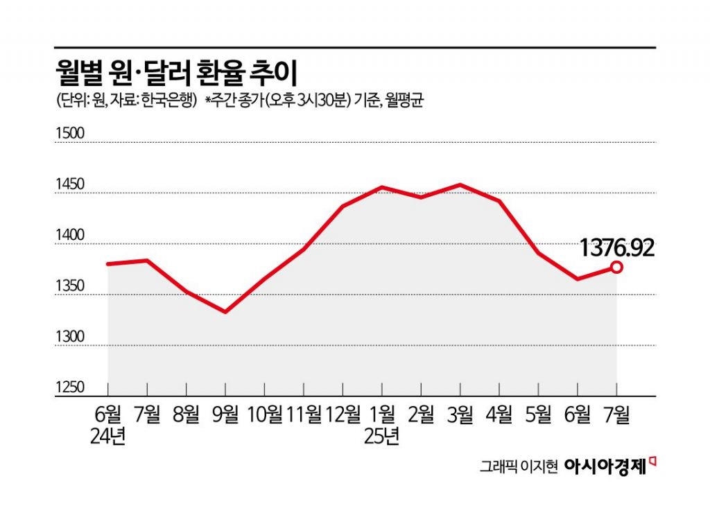 그러나 같은 날 야간 거래에서 원·달러 환율은 미국의 고용 쇼크 영향에 다시 1380원대로 내려앉았다. 미국 노동부가 발표한 고용보고서에 따르면 7월 비농업 일자리는 전월 대비 7만3000명 증가했다. 다우존스가 집계한 전문가 전망(10만명)을 크게 밑도는 수준이다. 시장에선 다시 미국 연방준비제도(Fed)가 9월 정책금리 인하에 나설 수 있단 기대가 고개를 들었다. 1일 원·달러 환율의 하루 변동 폭은 22.9원에 달했다. 월평균 원·달러 환율은 4월(1441.92원) 이후 5월(1390.7원), 6월(1365.15원) 연속 레벨을 낮췄으나 7월 들어 다시 오르면서 1376.92원을 나타내고 있는 모습이다.