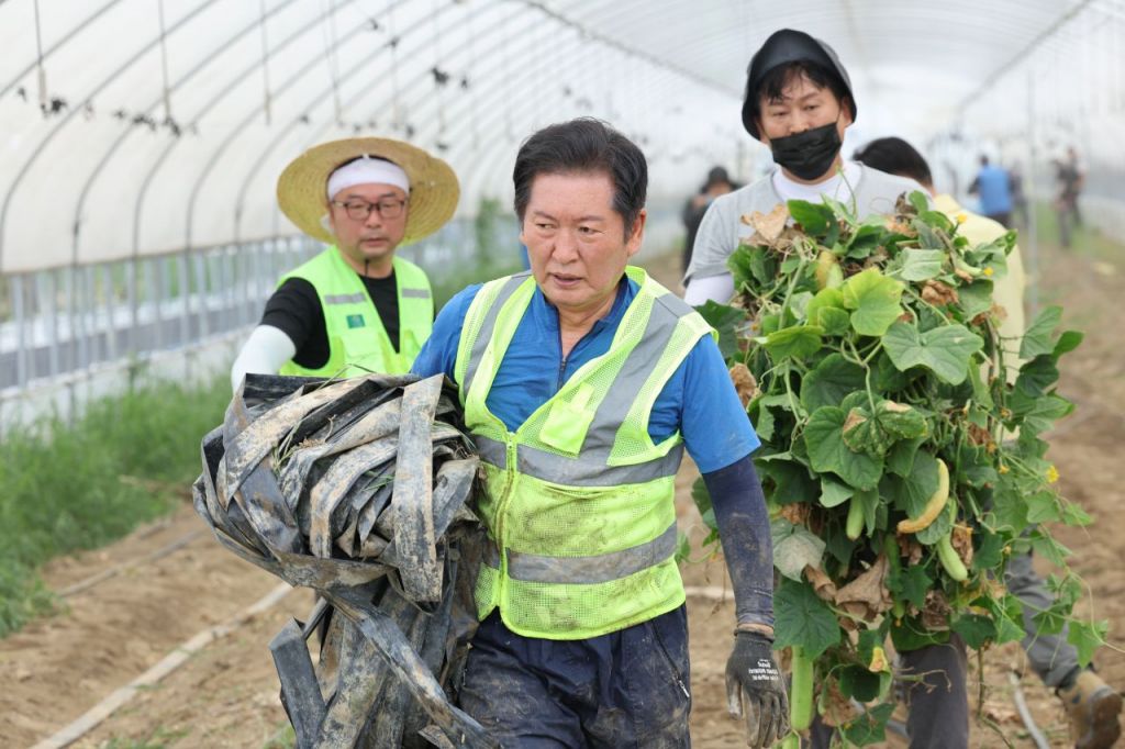 정청래 신임 더불어민주당 대표가 3일 오전 전남 나주시 노안면 오이농가를 찾아 수해 복구 작업을 하고 있다. 연합뉴스