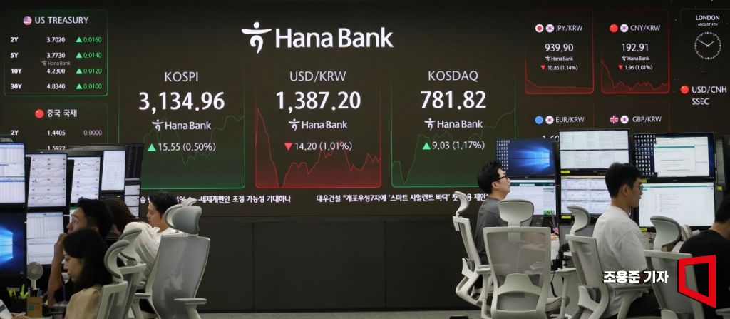 신고점 직전서 급락한 코스피가 반등을 시도하고 있는 가운데 4일 서울 중구 하나은행 딜링룸 모니터에 코스피를 비롯해 원/환율 등이 표시돼 있다. 이날 코스피는 전 거래일보다 5.14p(0.16%) 내린 3,114.27로 개장해 강보합세를 보이고 있다. 원/달러 환율은 11.4원 내린 1,390.0원, 코스닥지수는 1.04p(0.13%) 오른 773.83으로 시작했다.