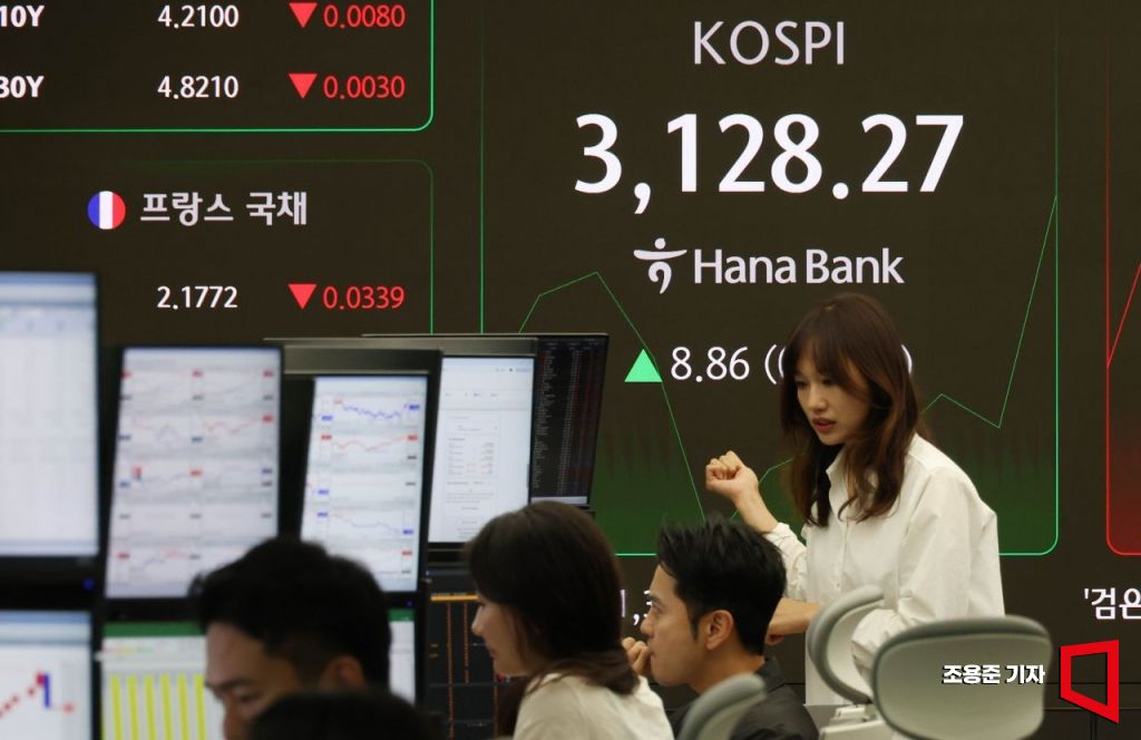 신고점 직전서 급락한 코스피가 반등을 시도하고 있는 가운데 4일 서울 중구 하나은행 딜링룸 모니터에 코스피를 비롯해 원/환율 등이 표시돼 있다. 이날 코스피는 전 거래일보다 5.14p(0.16%) 내린 3,114.27로 개장해 강보합세를 보이고 있다. 원/달러 환율은 11.4원 내린 1,390.0원, 코스닥지수는 1.04p(0.13%) 오른 773.83으로 시작했다.