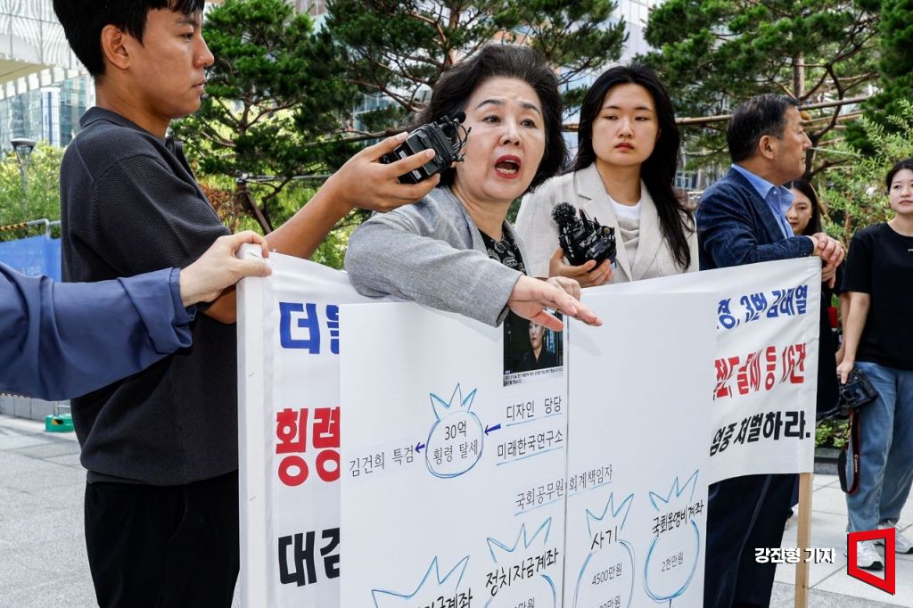 윤석열 전 대통령 부부와 정치브로커 명태균 공천개입에 연루된 의혹을 받고 있는 김영선 전 국민의힘 의원이 조사를 받기 위해 4일 서울 종로구 김건희특검 사무실로 출석에 앞서 기자회견 하고 있다.