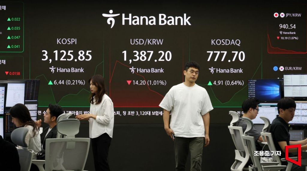 신고점 직전서 급락한 코스피가 반등을 시도하고 있는 가운데 4일 서울 중구 하나은행 딜링룸 모니터에 코스피를 비롯해 원/환율 등이 표시돼 있다. 이날 코스피는 전 거래일보다 5.14p(0.16%) 내린 3,114.27로 개장해 강보합세를 보이고 있다. 원/달러 환율은 11.4원 내린 1,390.0원, 코스닥지수는 1.04p(0.13%) 오른 773.83으로 시작했다.