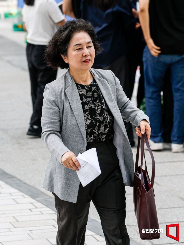 윤석열 전 대통령 부부와 정치브로커 명태균 공천개입에 연루된 의혹을 받고 있는 김영선 전 국민의힘 의원이 조사를 받기 위해 4일 서울 종로구 김건희특검 사무실로 출석하고 있다. 2025.8.4. 강진형 기자