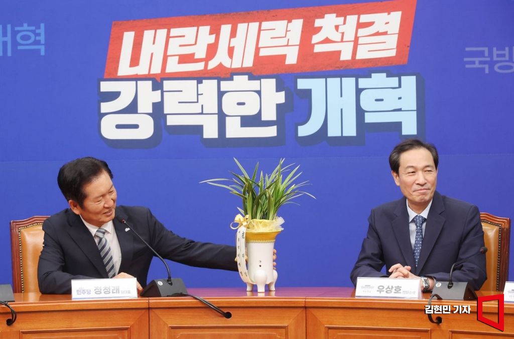 정청래 더불어민주당 신임 대표는 4일 우상호 대통령실 정무수석비서관을 접견했다. 정 대표와 우 정무수석은 당과 정부가 '원팀'이 될 수 있도록 노력하겠다고 다짐했다.