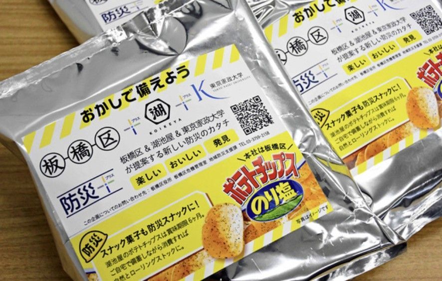 주요 지방자치단체도 방재 과자 준비를 권고한다. 도쿄도는 2021년 방재 훈련 당시, 일본의 유명 감자칩 제조사 '코이케야'와 협력해 방재식 감자칩을 만들어 시민들에게 나눠줬다. 이후 코이케야는 방재식 용도로 별도 포장된 감자칩을 생산해 판매 중이다.