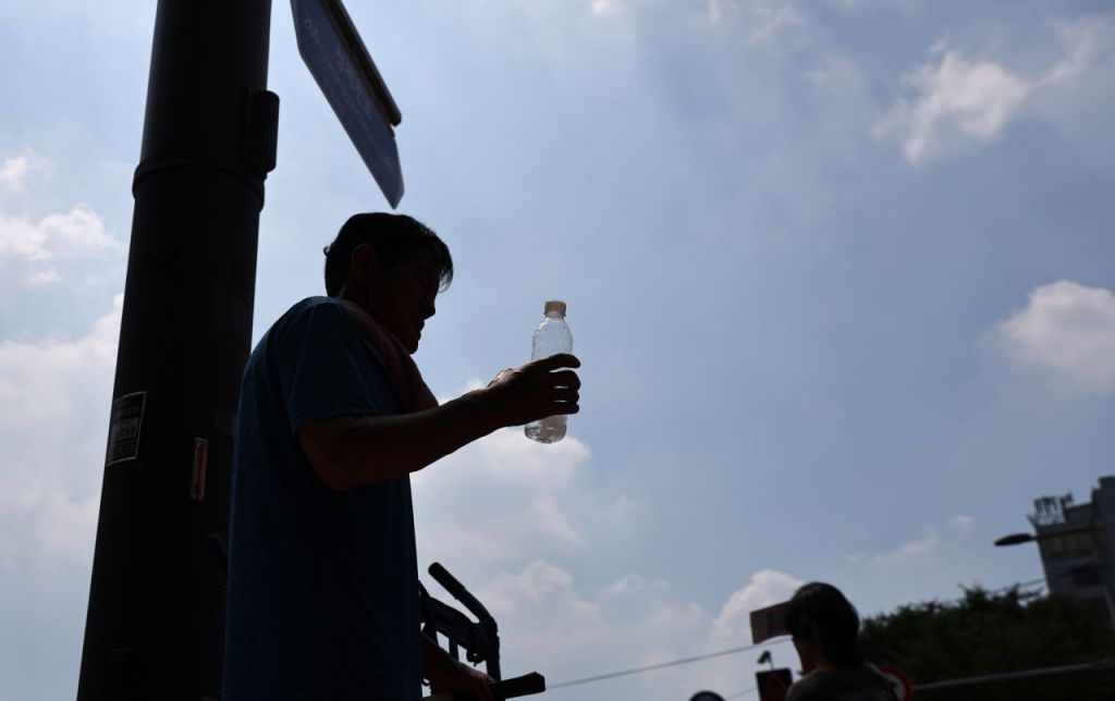 서울 동대문종합시장 인근에서 한 근로자가 원단을 옮긴 후 물을 마시며 휴식을 취하고 있다. 연합뉴스