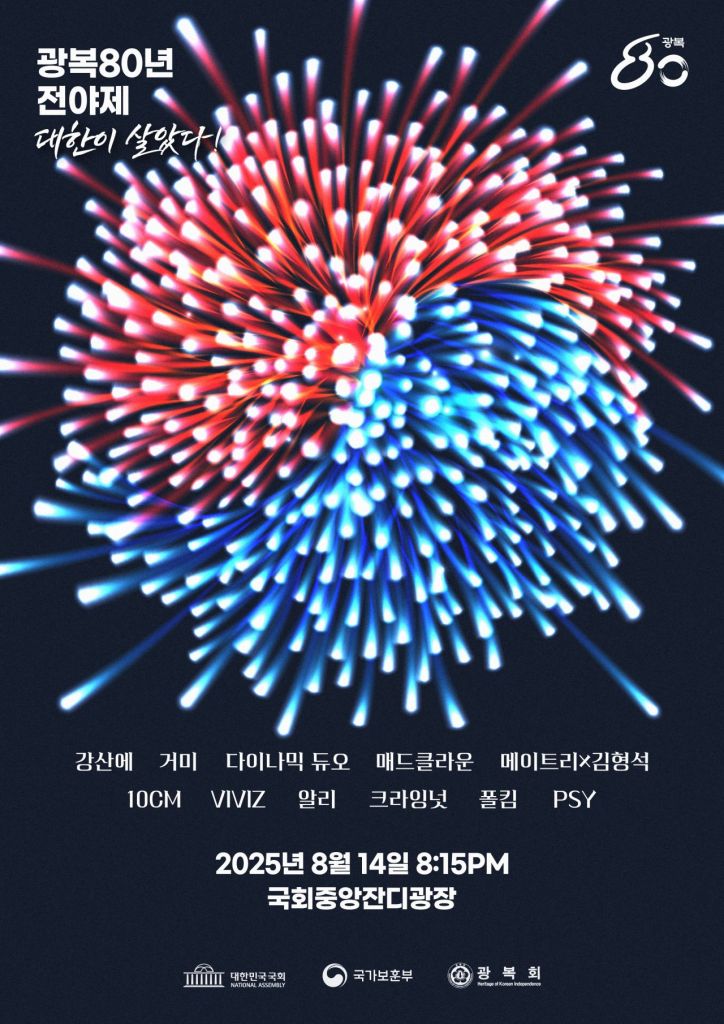 국회, 국가보훈부, 광복회가 공동으로 주최하는 광복 80년 전야제 '대한이 살았다!'가 오는 14일 오후 8시 15분 국회 중앙 잔디광장에서 열린다. 그동안 광복절을 기념하는 민간단체와 정부 차원의 행사는 있었지만, 입법부, 행정부, 독립운동 선양단체가 함께 주최하는 공식 전야제는 이번이 처음이다.